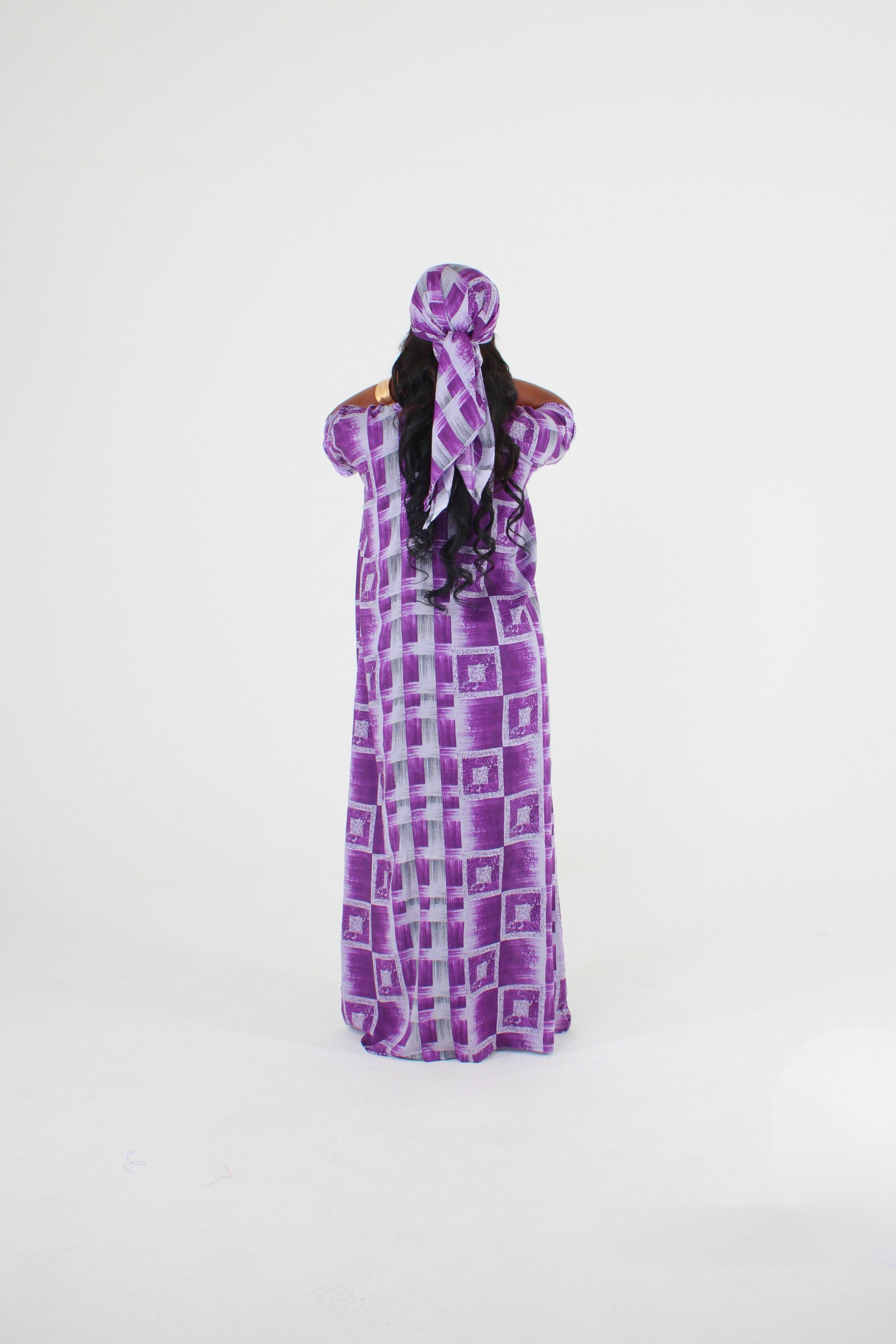 Bamako in Purple is bold in presence yet soft in soul. With its geometric lilac pattern and delicate lace trim, it flows effortlessly — a timeless piece for the woman who knows her worth.